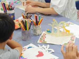 各回45分のタイムスケジュールで、はじめの約5分間はザンビアで撮った写真を見ながらの弊社及びバナナペーパーの簡単な紹介、残りの約40分間はポップアップカード作りを行いました。