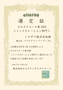 弊社のバナナペーパーグッズが、大学生を中心とした若者がエシカル/サステナブルな製品・サービス・企業の取り組み事例を選出する「オルタナユース賞2025」に選ばれました。オルタナユースとは、サステナブルな社会の実現に向けて、サステナビリティに関する情報を集め発信し課題解決を目指す学生のコミュニティです。1次~3次選考の結果、「学びや体験性」部門(=インスピレーション部門)で最多得票をいただき、10月3日(金)の表彰式に弊社社長が出席させていただきました。