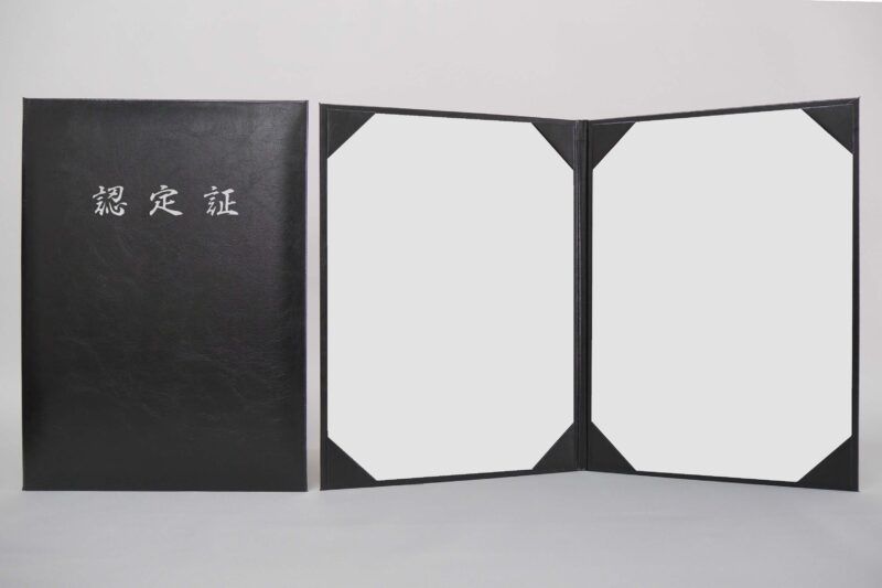 認定証/VP/黒/証書サイズB5(257×182㎜)/紹介番号2-1 認定証(認定書)を収納するホルダーを製作しました。 タイトル:認定証 証書サイズ:B5(縦257×横182㎜) 証書枚数:2枚 表紙素材:VP 表紙素材の色:黒 裏(見返し素材):バナナペーパー 裏(見返し素材)色:白 箔押:銀 厚み有か無か:あり 重さ/g:370g 展開した際の外寸(縦×横)㎜:縦315×横463㎜ 二つ折りの際の外寸(縦×横)㎜:縦315×横230㎜ コーナー素材:VP(黒) コーナー数:8