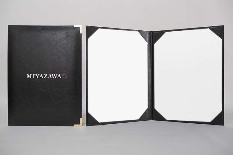 表彰状/VP/黒/証書サイズA4(297×210㎜)/紹介番号2-22 表彰状を収納するホルダーを製作しました。 タイトル:MIYAZAWA(表彰状) 証書サイズ:A4(縦297×横210㎜) 証書枚数:2枚 表紙素材:VP 表紙素材の色:黒 裏(見返し素材):バナナペーパー 裏(見返し素材)色:白 箔押:金、白 厚み有か無か:あり 重さ/g:380g 展開した際の外寸(縦×横)㎜:縦315×横470㎜ 二つ折りの際の外寸(縦×横)㎜:縦315×横232㎜ コーナー素材:VP(黒) コーナー数:8