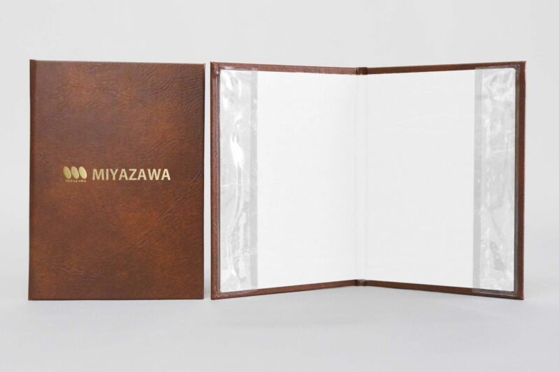 保証書・鑑定書/VP/茶/証書サイズB6(180×127㎜)/紹介番号2-19 保証書(保証証)・鑑定書(鑑定証)を収納するホルダーを製作しました。 タイトル:MIYAZAWA(保証書・鑑定書) 証書サイズ:B6(縦180×横127㎜) 証書枚数:1枚 表紙素材:VP 表紙素材の色:茶 裏(見返し素材):バナナペーパー 裏(見返し素材)色:白 箔押:金 厚み有か無か:なし 重さ/g:60g 展開した際の外寸(縦×横)㎜:縦140×横207㎜ 二つ折りの際の外寸(縦×横)㎜:縦140×横103㎜ 袖ポケット素材:透明塩ビ袖 袖ポケット数:両サイド