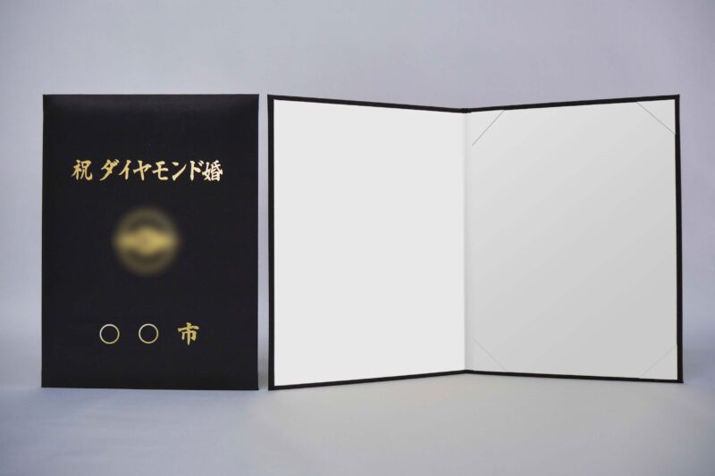 ブライダル/布/紫/証書サイズA4(297×210㎜)/紹介番号2-27 ダイヤモンド婚式に使用するホルダーを製作しました。 タイトル:祝 ダイヤモンド婚(証明書・証明証) 証書サイズ:A4(縦297×横210㎜) 証書枚数:1枚 表紙素材:布 表紙素材の色:紫 裏(見返し素材):バナナペーパー 裏(見返し素材)色:白 箔押:金 厚み有か無か:あり 重さ/g:370g 展開した際の外寸(縦×横)㎜:縦322×横482㎜ 二つ折りの際の外寸(縦×横)㎜:縦322×横240㎜ コーナー素材:バナナペーパー コーナー数:4