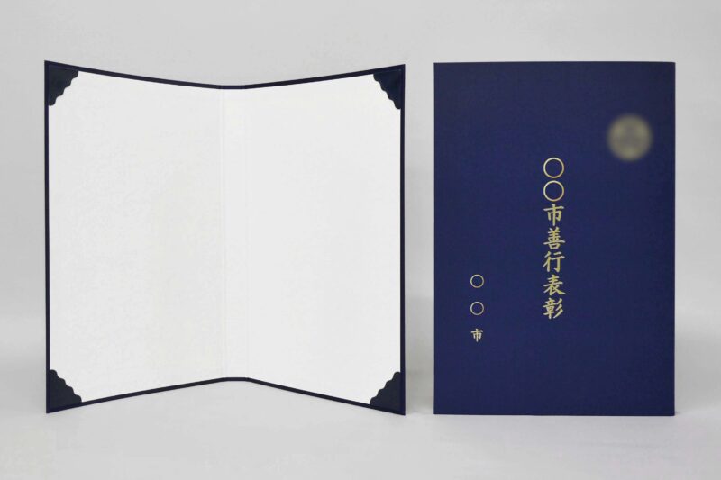 表彰状/布/紺/証書サイズB3(365×515㎜)/紹介番号2-15 表彰状を収納するファイル(セアール)を製作しました。 表彰状に折り目が付きづらいタイプとなっております。 タイトル:○○市善行表彰(表彰状) 証書サイズ:B3(縦365×横515㎜) 証書枚数:1枚 表紙素材:布 表紙素材の色:紺 裏(見返し素材):バナナペーパー 裏(見返し素材)色:白 箔押:金 厚み有か無か:なし 重さ/g:380g 展開した際の外寸(縦×横)㎜:縦377×横542㎜ 二つ折りの際の外寸(縦×横)㎜:縦377×横258㎜ コーナー素材:塩ビ(紺) コーナー数:4