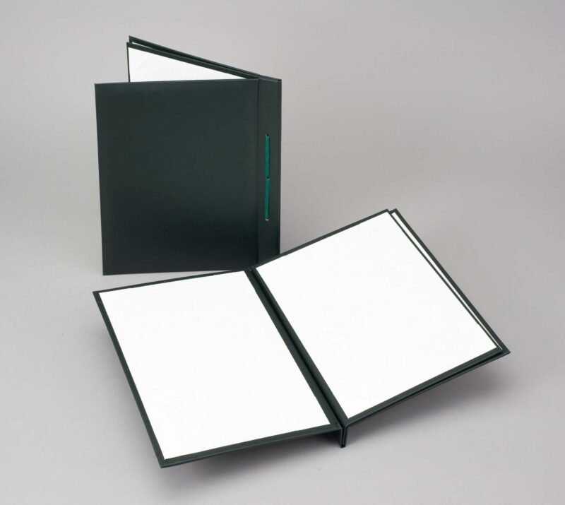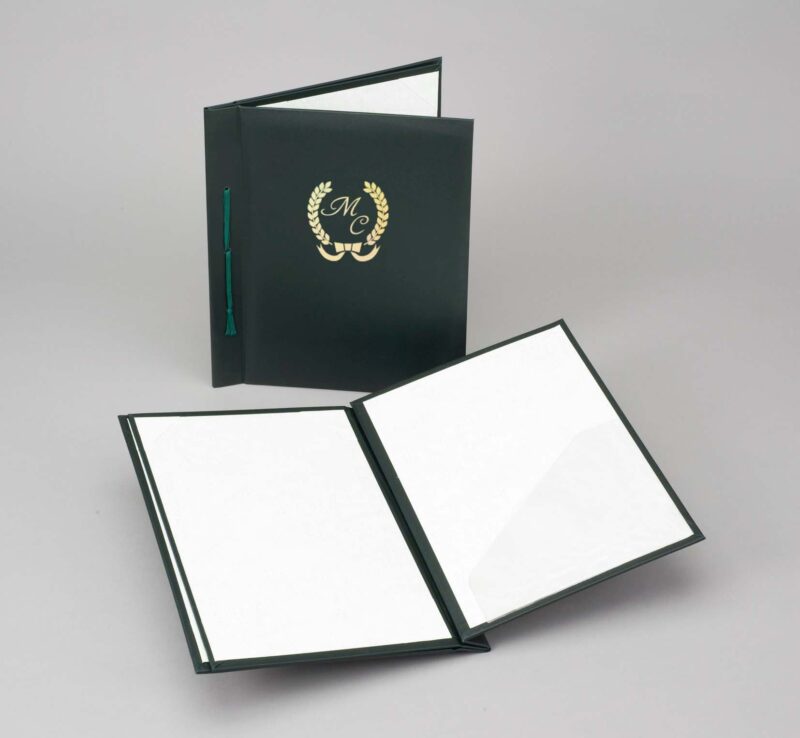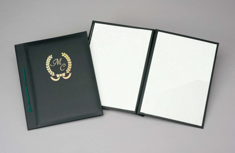 免許状/特注/VP/黒/証書サイズA4(297×210㎜)/紹介番号1-8 免許状などを収納するホルダーを製作しました。 タイトル:免許状 証書サイズ:A4(縦297×横210㎜) 証書枚数:3+1枚 表紙素材:VP 表紙素材の色:黒 裏(見返し素材):バナナペーパー 裏(見返し素材)色:白 箔押:金 厚み有か無か:あり 重さ/g:700g 展開した際の外寸(縦×横)㎜:縦322×横477㎜ 二つ折りの際の外寸(縦×横)㎜:縦322×横269㎜ コーナー素材:共紙 コーナー数:12