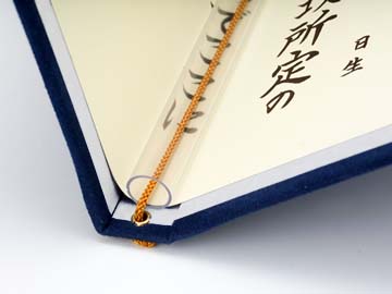 B4・A3版の証書を二つ折りで収納する際に極力折り目が付かないようにと考案された、実用新案登録製品です。 製品の種類は、丸背と角背があります。角背の場合は背に文字の箔押しも可能です。